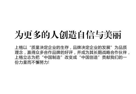 上格一路走來,以“締造時尚集團,使公司受人尊敬,令人向往;為客戶提升價值,創(chuàng)造成功;讓員工提高生活品質,實現(xiàn)自我價值”作為我們的目標,“為更多的創(chuàng)造自信與美麗” 作為我們的使命,立志為把“中國制造” 改變成“中國創(chuàng)造”貢獻我們的一份力量而不懈努力!